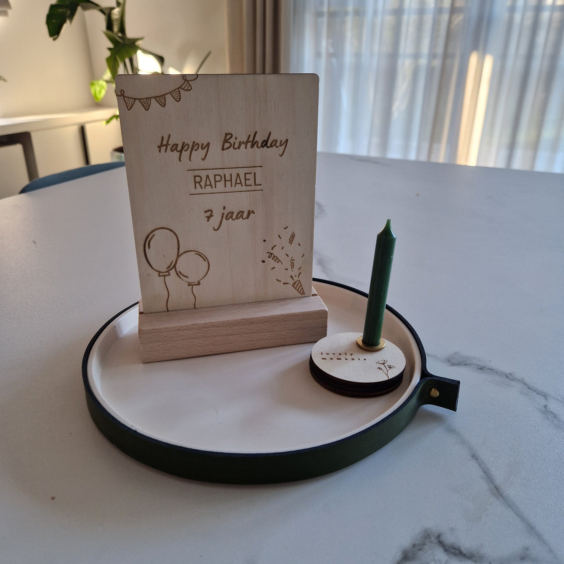 Een houten kaart om je verjaardagsfeest in de kijker te zetten. Leuk als tafeldecoratie of welkomstbordje.