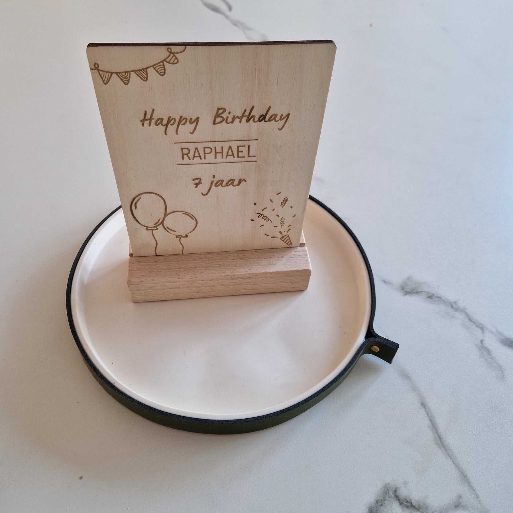 TIP: Je kan het kaartje ook voorzien van een kaarthouder in hout. Deze kan je apart bijbestellen.